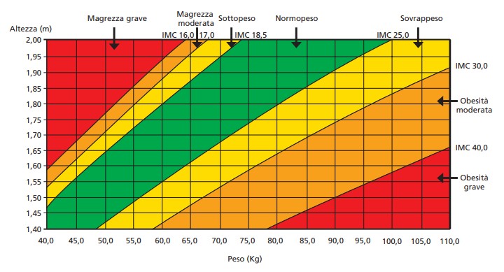 Esempio: un uomo di 80 kg, alto 1,85 m., avrà un IMC = 80 : 1,85 : 1,85 = 23,4 e rientrerà nella categoria normopeso