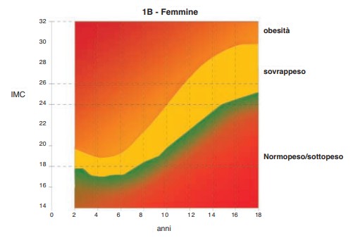 Esempio: una bambina di 11 anni che pesa 38 kg ed è alta 1,43 m avrà un IMC = 38 : 1,43 : 1,43 = 18,6 e rientrerà nell’area normopeso/sottopeso