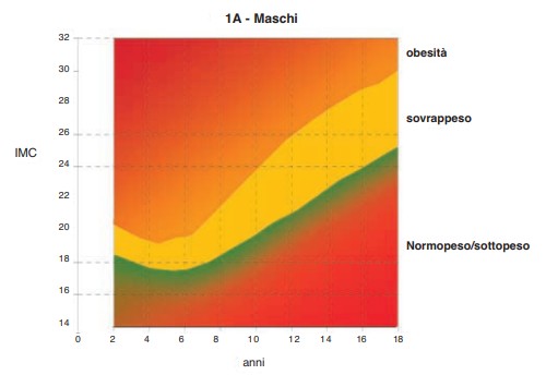Nota bene: Non esiste attualmente un criterio basato sull’IMC che permetta di distinguere i bambini sottopeso da quelli normopeso. Tale valutazione va fatta dal pediatra ed è particolarmente opportuna nel caso in cui il valore ottenuto si collochi nell'area rossa della sezione normopeso/sottopeso.